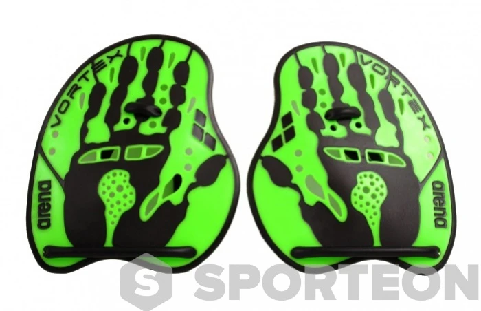 Black silicone straps for hand attachment are also included in the package. You can set these straps exactly according to your needs. The Arena Vortex Evolution is made of polypropylene, they are green , and the Arena logo is printed on the bottom of the paddles.