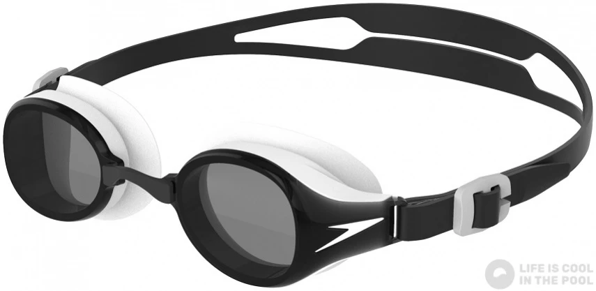 Swimming goggles have doubled straps in the middle. From the sides of the eyepieces there is one strap that is divided in the middle. The advantage of splitting tape is better handling and more comfortable tightening. The doubled straps ensure better hold of the goggles.